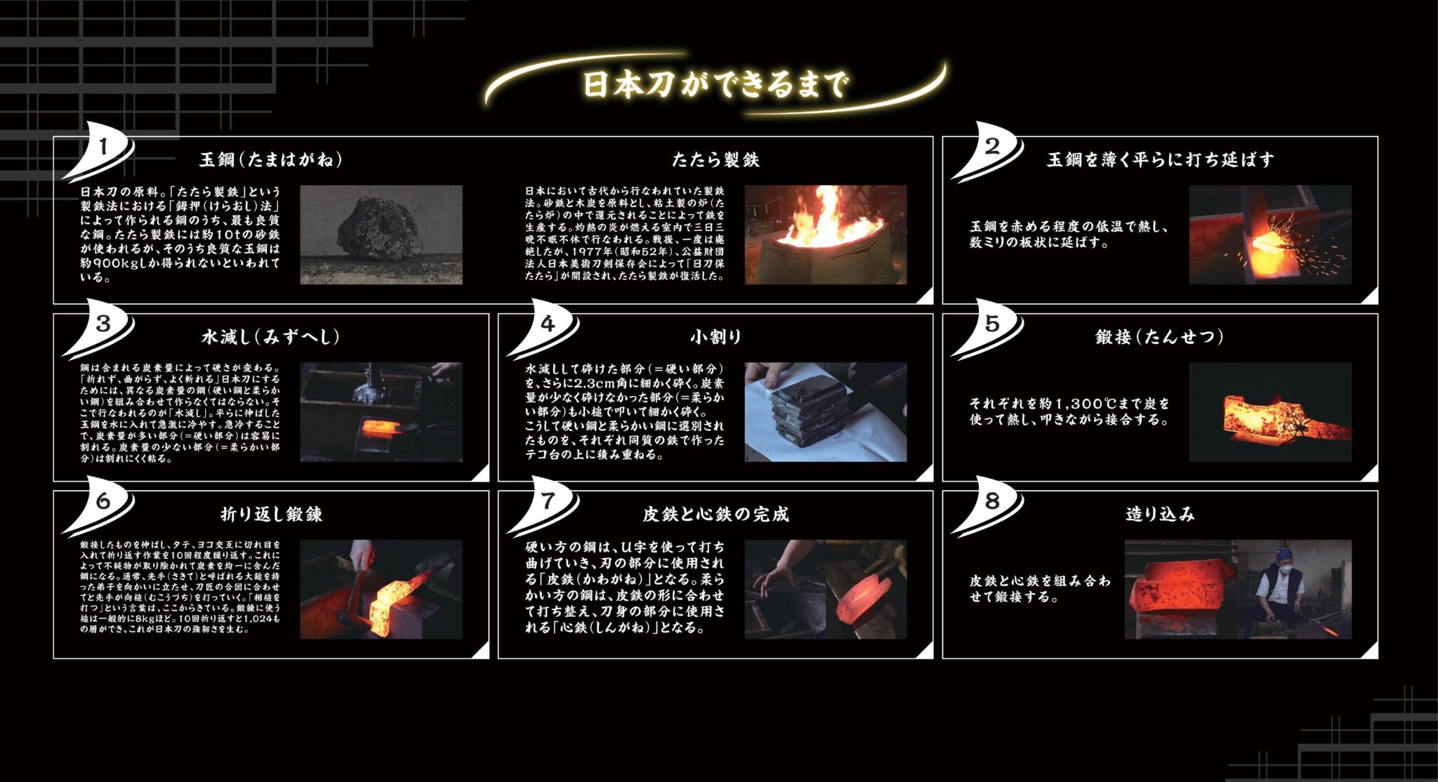 修業前の学生時代から古名刀の魅力の本質を技術的 技法的探究をし続けて30年以上 時代ごとに異なる刀剣の美しさと奥行きを 技法や素材の性質の違いから分類し 五ヶ伝といわれる各伝法を表面的な再現で満足せず より深みをもった魅力を目指し取り組んでおります また刀剣の鑑定 鑑賞も長年の経験のなかで数々の名品に触れる機会を得てきました そうして培ってきた鑑識眼も 作刀技術と同様に私の一つの財産です しかし名品を観ることと同じ視座で当作を見つめるということは ある意味では残酷で苦しい行為です この頃はやっと名刀の「位」の高みに わずかながら近づいている実感も得られるようになってきました 刀剣の美の奥行きを作品の内側から体現できるよう そしてそれをご依頼主に感じてもらい ご満足いただけるよう 真摯に作りつづけ 歩みつづけていきたいと思います 材料となる鋼は日刀保たたらの玉鋼を用いるのが主流ですが 当鍛刀場では玉鋼のみならず各種の古材の卸鉄づくりと活用 小規模のたたら炉で砂鉄から鋼を生み出す自家製鉄にも取り組みはじめています また 北欧のたたら製鉄実践者との交流で国内材料に限らない素材の探究も 名刀へ迫っていくためのひとつの要素とし 素材ごとに異なる性質や特性 メリットデメリットを整理して 目標とする作風に最適と思われる材料を選定しています 選定された素材と独自の鍛錬技法をもって より本質に到達するような美的な深みを作品に体現します For over thirty years—since my days as a student before formally beginning my training—I have pursued a technical and methodological inquiry into the essence of what makes classical Japanese swords so captivating. The aesthetic depth and distinctive beauty of swords vary by historical period. I have devoted myself to categorising these differences through the lens of technique and material characteristics, and in my work I strive not merely for surface-level reproductions of the five traditional schools of swordsmithing known as the Gokaden, but to express something deeper, something more resonant. Over many years of appraising and studying swords, I have had the rare opportunity to examine a number of true masterpieces firsthand. The discerning eye I have developed through these experiences is, to me, no less valuable than the skills I have gained in forging blades. Yet to hold my own work to the same exacting standard as those revered masterpieces is, in a sense, a harsh and demanding act. It is not without pain. Still, I have recently begun to feel, if only slightly, that I am finally approaching the dignified realm in which those great swords reside. I will continue to forge with sincerity, striving to embody the profound aesthetic of the Japanese sword from within the blade itself, so that each commissioned piece may evoke this depth of beauty and bring lasting satisfaction to its owner. While the standard steel used in sword-making today is tamahagane produced by the NBTHK's traditional tatara furnace, I go beyond this in my own forge. I work not only with tamahagane, but also with a variety of historical iron sources, recreating raw steel from antique materials. Recently, I have also begun smelting my own steel from iron sand using a small-scale tatara furnace. Through collaboration and dialogue with practitioners of traditional smelting techniques in Northern Europe, I have expanded my exploration of materials beyond those found in Japan. Understanding the differing properties, strengths, and limitations of each type of steel allows me to select the most appropriate material for the particular aesthetic and technical outcome I aim to achieve. By carefully choosing each material and applying my own distinctive forging methods, I seek to embody a deeper and more essential beauty in every sword I create.
