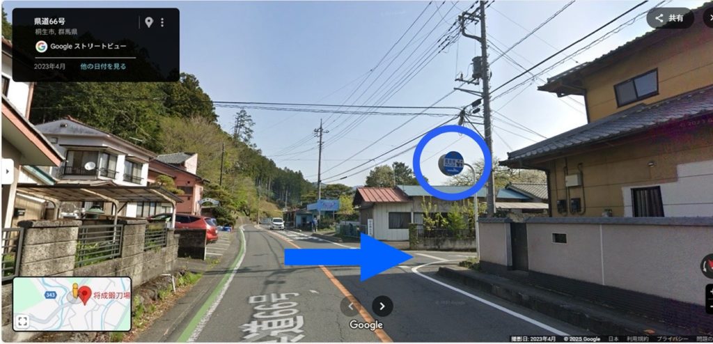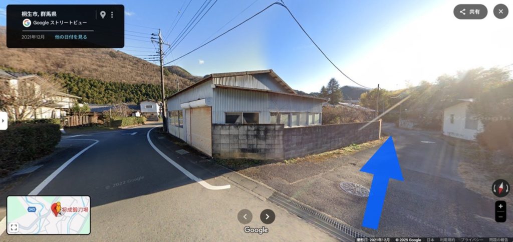 県道66号線を曲がりましたら こちらの路地を右折して 最奥に当鍛刀場がございます